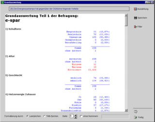 GrundauswertungMit der Grundauswertung bekommen Sie einen ersten Überblick über das gesamte erhobene Datenmaterial. Neben absoluten und relativen Zahlenwerten gibt die Grundauswertung auch Auskunft zu aufschlussreichen statistischen Kennwerten, wie beispielsweise Mittelwert und Median. GrafStat formatiert die Grundauswertung als Richtext-Datei. Sie können sie speichern und als Bestandteil eines Reports in andere Dokumente übernehmen. Auch eine Weiterverarbeitung in Excel oder OpenOffice Calc ist über das Windows-Clipboard schnell erledigt, wenn das Tabzeichen als Formatierungszeichen eingestellt wird. |